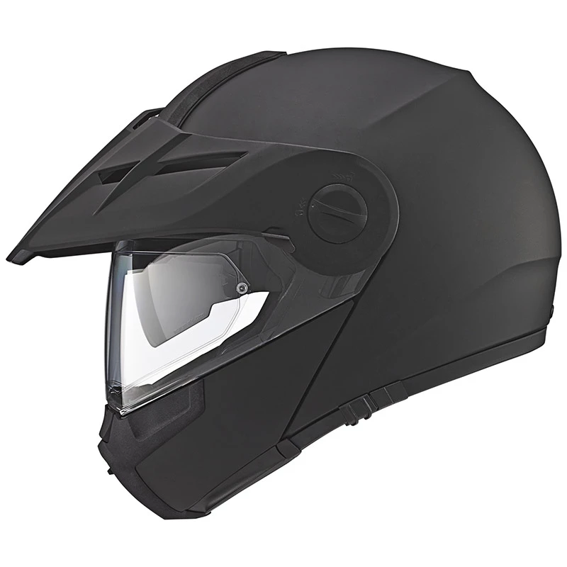 – and offroading. The motor cycle helmet is in accordance with the testing standard ECE R 22.05 and can therefore be used throughout Europe. The E1 is available in sizes from XS to 3XL. This conforms to head circumferences from 52 to 65 centimetres. A complex air channel system on the inside of the helmet shell provides a comfortable air flow. The head aeration leads the air into the helmet for circulation. The visor aeration prevents the visor screen misting-up. The large regulatable auxiliary aeration on the chin piece gives you space to breathe on demanding tours. It adds fresh air by the litre when it really counts. All SCHUBERTH visors are visors of the optical class 1. They warrant an undistorted view and are anti-scratch treated. Turbulators for noise reduction on the visor edge. The visor mechanics allow a quick exchange completely without tools. Of course the E1 features an anti-mist screen. A sun visor is built into the E1 straight away. The sun visor can be extended or retracted with one move of the hand using a slider on the helmet edge. Now you can react lightning fast to sudden sun glare. The chin piece of the E1 can be swivelled up as a single piece together with the visor and shield. The shield can be fixed in three different positions. The visor can be used independently from the shield. COOLMAX® textiles provide a good climate on the inside of the helmet and transport moisture effectively away. This creates constantly a good climate and permanent cooling for the driver. Of course the inner lining is Öko-Tex 100. It can be removed easily and can be washed. The E1 is stable in the wind, without pendulum effect, lift, or buffeting and on top of it is extremely quiet. Apart from the adapted helmet shape, a spoiler is responsible for this streamlining. It has been tested many times in the wind channel, has been improved and designed for maximum wear comfort. Radio, navigation and communication in the same helmet size. The SCHUBERTH SRC-System™ PRO: Easy to install. Easy to control. Perfectly integrated into the helmet.