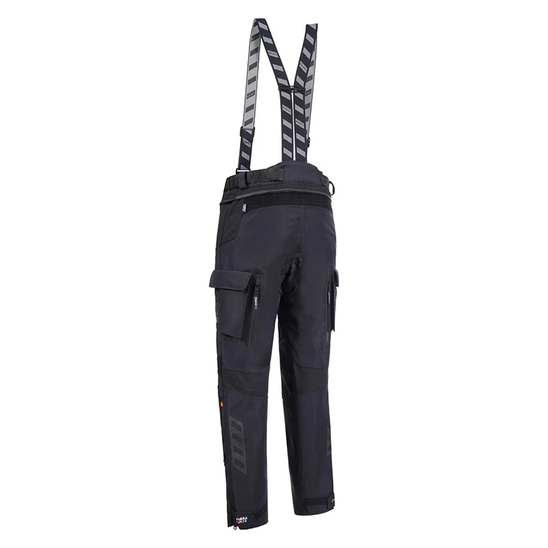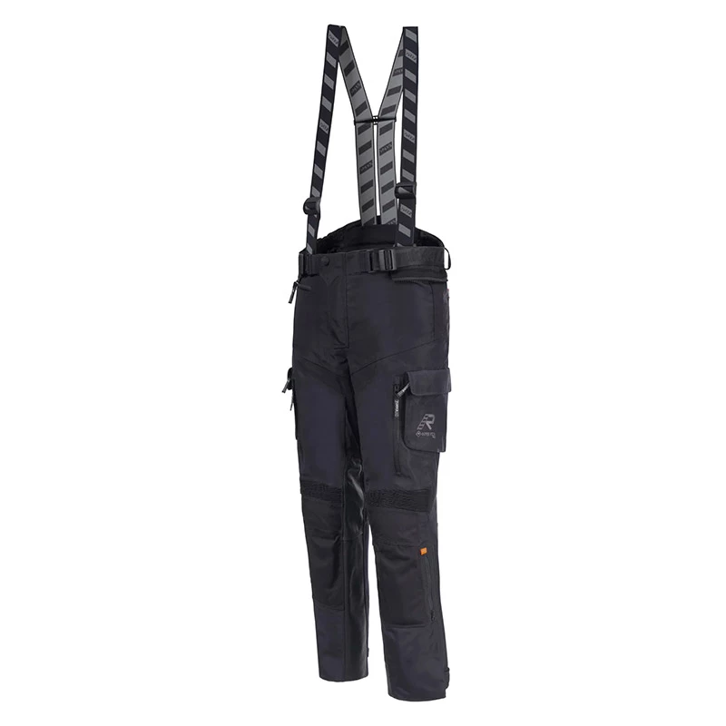 Rukka Adventure motorcycle trousers for men. Rukka AirCushion system in the seat area. Heat and abrasion resistant leather patches on inner side of knees and on seating area. Stretch panels in the crotch and inner thighs, above and behind the knees and at the back. Adjustable waist belt. A connecting zipper for trousers. Waist closure with press button. Adjustable leg bottoms with zippers and velcro tightening. Detachable Rukka Defence & Comfort braces. 100% breathable, wind